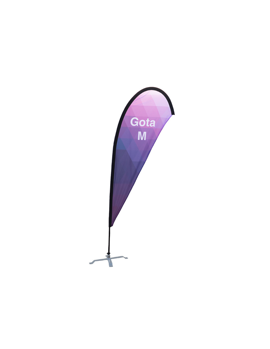 Conjunto de flag banner gota ideal para ferias, celebraciones o eventos como festivales, congresos o competiciones. La gráfica puede confeccionarse en diferentes tallas, según la que se necesite para la ocasión: talla S (750x1735mm), M (922x2166mm), L (1037x2986mm) y XL (1368x3528mm). Si lo deseas, la puedes personalizar al completo con un diseño original, el logotipo de tu marca o el nombre del evento o feria. Las gráficas de flag banner publicitarios son personalizados ya que están sometidos a la técnica de sublimación consiguiendo un diseño único y original.
