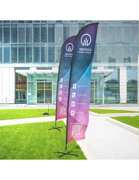 La gráfica puede confeccionarse en diferentes tallas, talla S (555x2267mm), M (655x2733mm), L (755x3520mm) y XL (755x4170mm). Lo más original es que puedes personalizar tu gráfica al 100% con el logotipo de tu empresa, el nombre del evento o con cualquier diseño que desees. Los flag banner publicitarios son personalizados ya que están sometidos a la técnica de sublimación consiguiendo un diseño único y original.