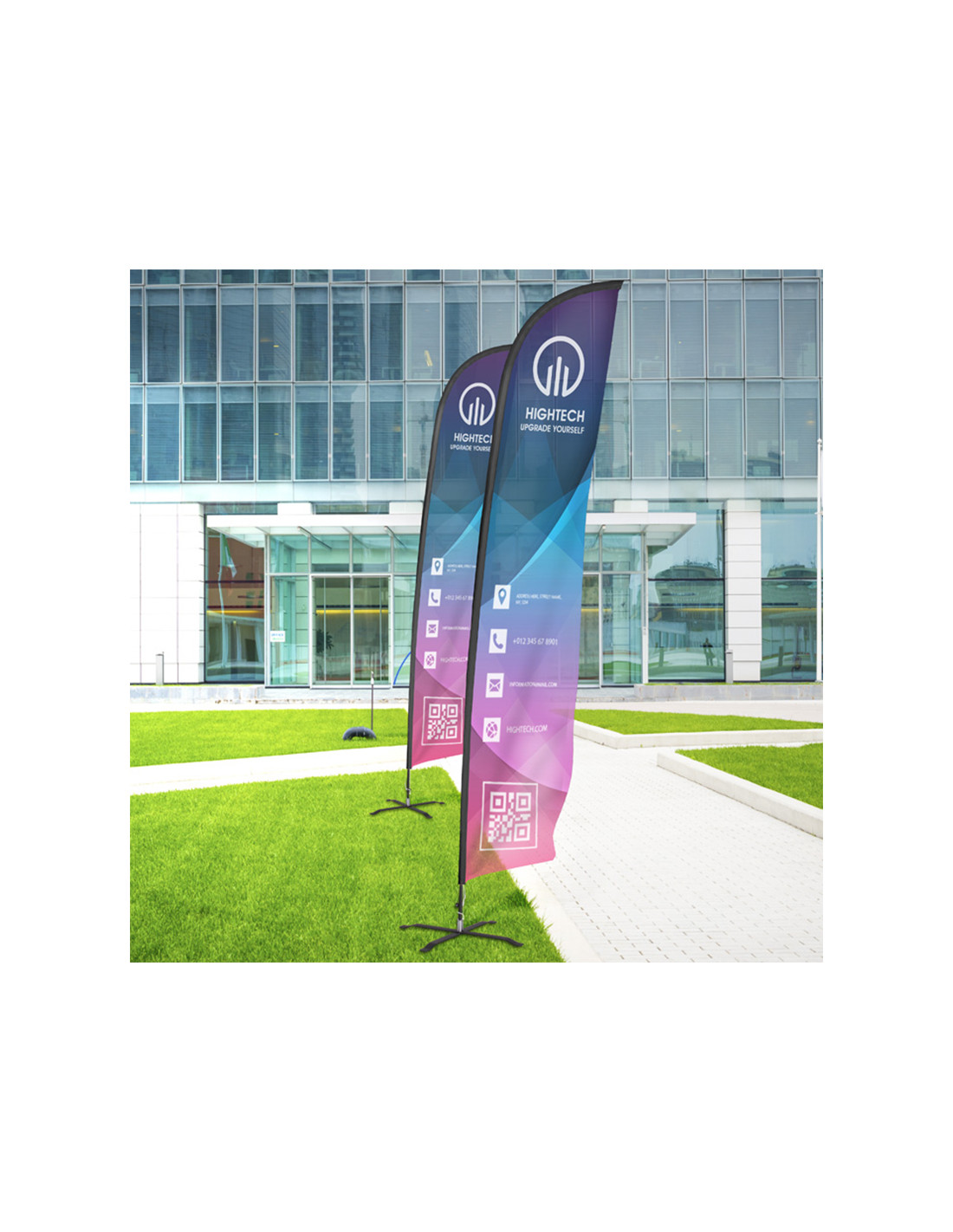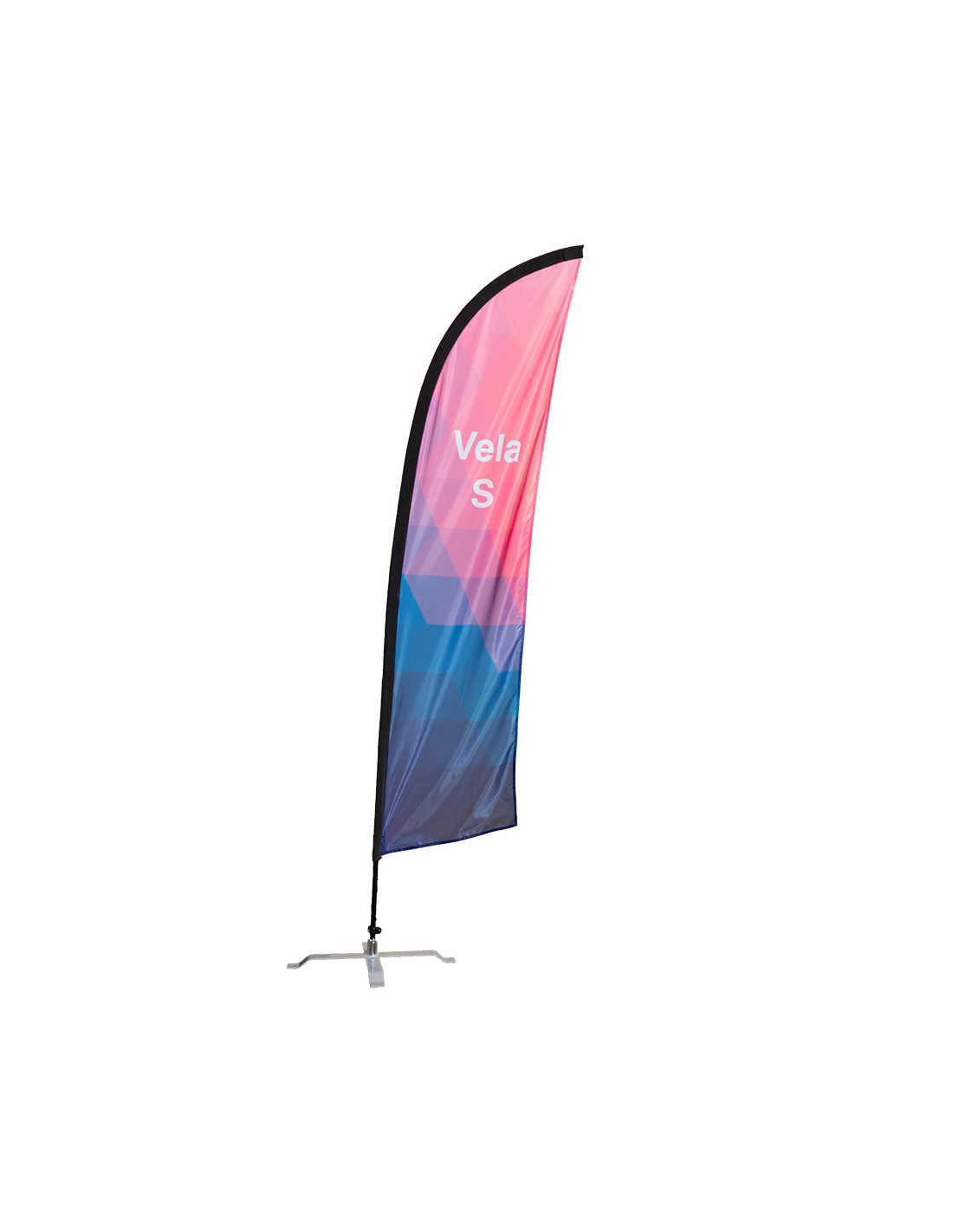 El conjunto de flag banner Vela incluye una gráfica en tejido Poliéster 110g, una estructura metalizada y cualquiera de los soportes disponibles. Es perfecta como indicadores en eventos culturales, congresos o convenciones, también para ferias y celebraciones especiales.