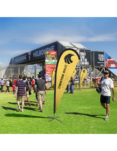 La gráfica para flag banner Gota es ideal para publicitar nuestra marca o sponsors en ferias, eventos, festivales y competiciones deportivas. Su diseño tiene un acabado en arco en la parte superior y simula una forma de gota. Se puede complementar con todos los soportes para flag banner disponibles y se puede personalizar desde cero, así que ¡Puedes poner el diseño que desees!