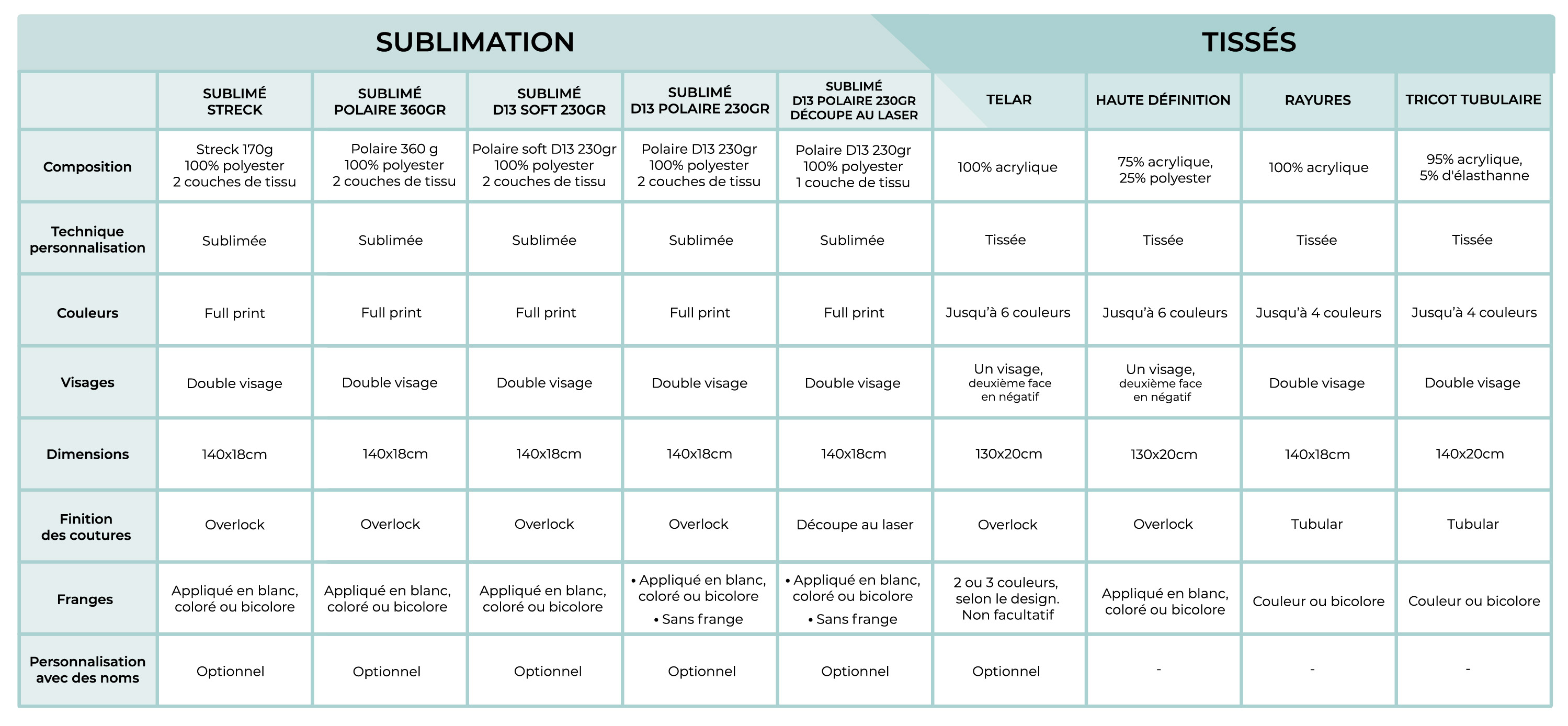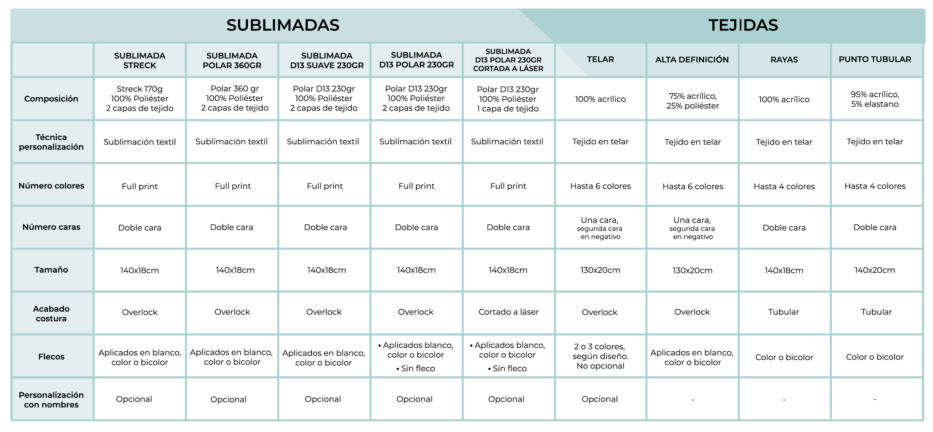 Tabla comparativa de bufandas sublimadas y bufandas tejidas