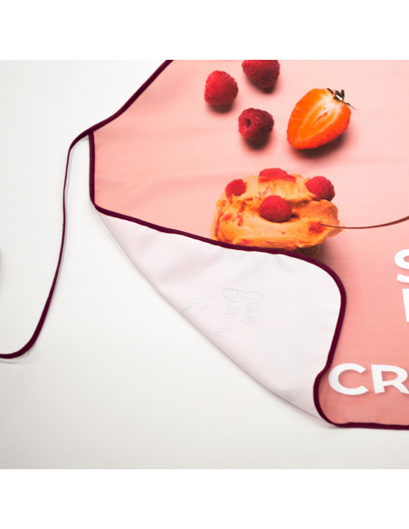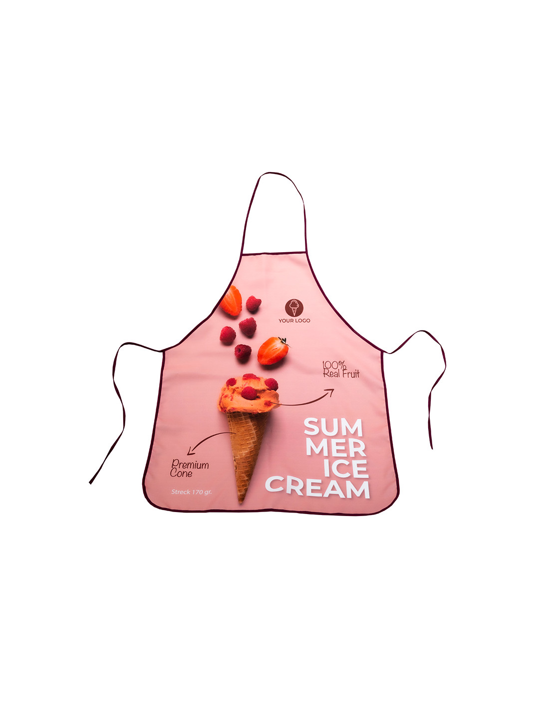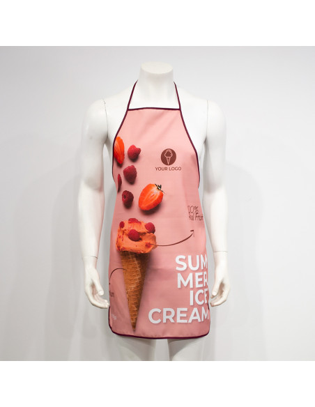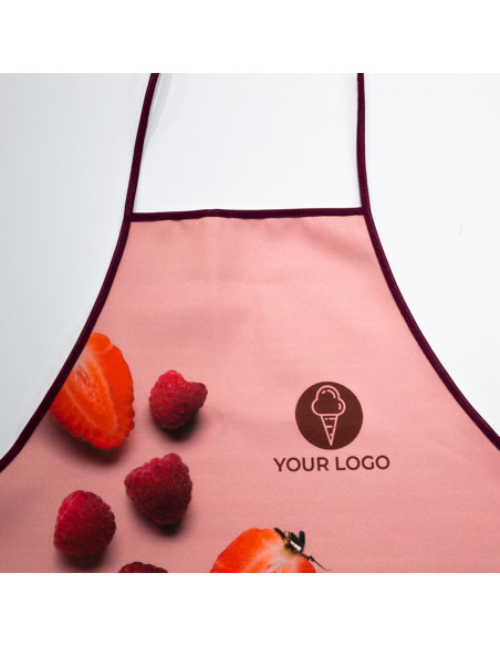 Delantal de cocina económico tamaño adulto personalizado al 100%. Este delantal no pone límites a tu creatividad y te permite personalizarlo a todo color para darle un toque especial y destacar en tu empresa. El precio incluye la personalización a todo color.
