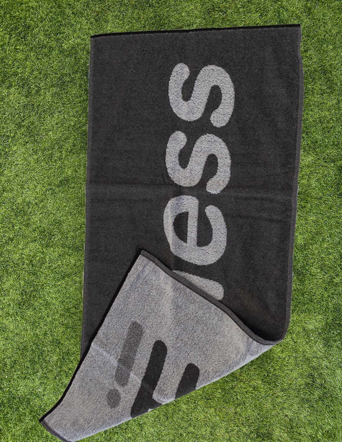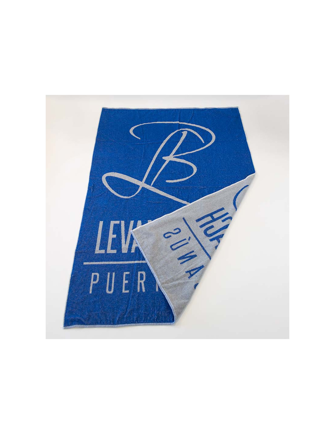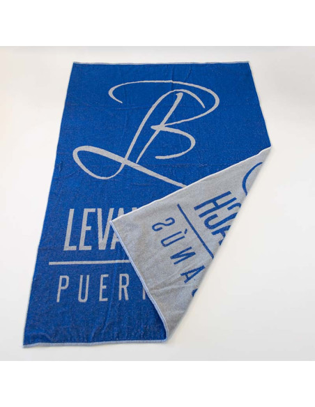 Toalla de algodón disponible en tres medidas diferentes: 50x100cm, 70x140cm y 100x150cm. Son toallas tejidas y personalizables con dos colores, por una cara se ve el diseño a dos colores y en el reverso se ve el diseño en negativo. Estas toallas personalizadas cuentan con 450g para hacerlas lo suficiente idóneas para un buen secado.