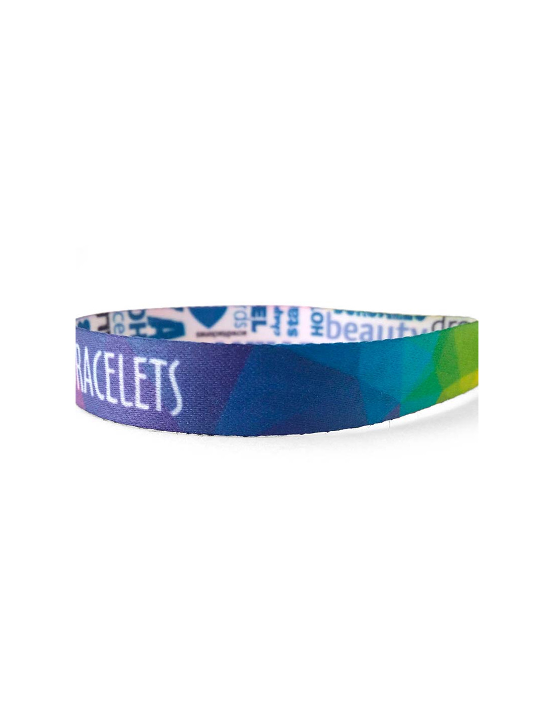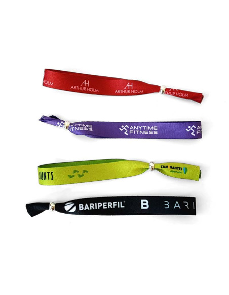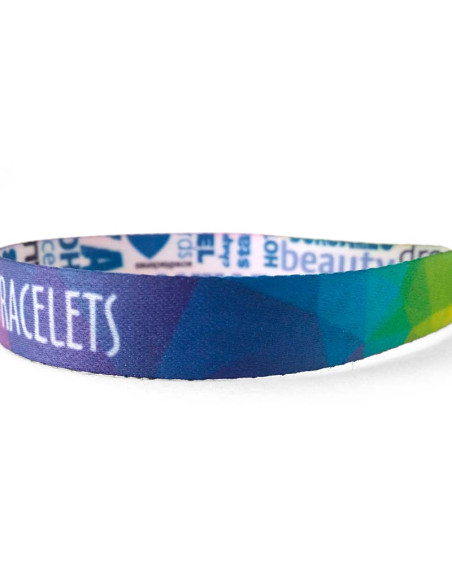 Pulsera en composición de tejido de mate de 439 g, personalizable a todo color con sublimación con el nombre del evento, logo de marcas patrocinadoras o una frase. La calidad de tejido la convierte en una pieza suave al tacto. Es un producto perfecto como entrada a eventos del estilo de festivales de música o conciertos, o también como detalle en carreras benéficas. Más gruesa y robusta que el modelo festival.